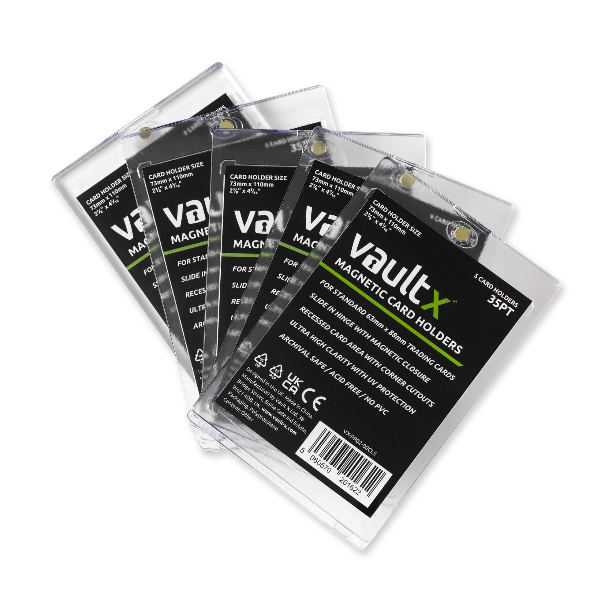 5 high clarity, 35pt magnetic card holders for sports & trading cards. Internal holder size 64mm x 89mm providing great protection for all standard size cards up to 35pt thickness. Made from stationery grade, UV blocking, card safe materials.